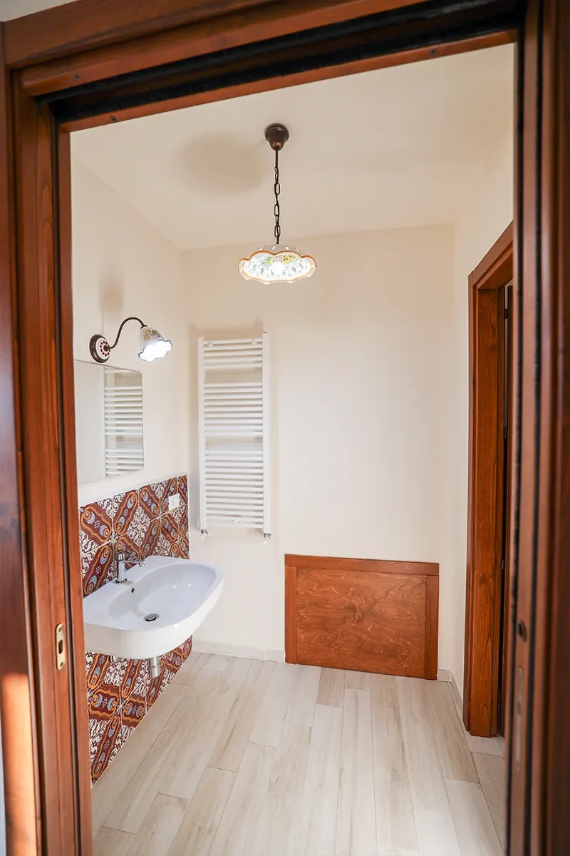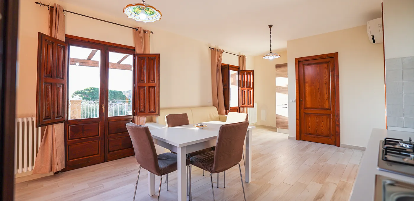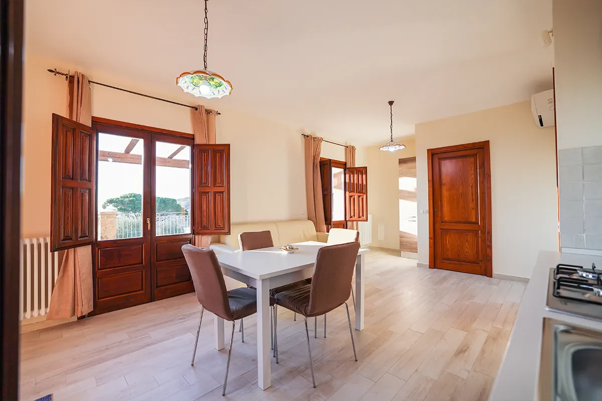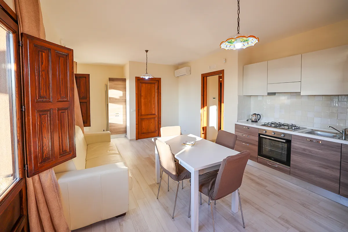 Funzionalità e stile accolgono gli ospiti che scelgono di alloggiare all’interno dell’appartamento a pian terreno di Case Rapputi, un ambiente arioso dove il calore del parquet si sposa con la luce naturale che inonda gli interni.
