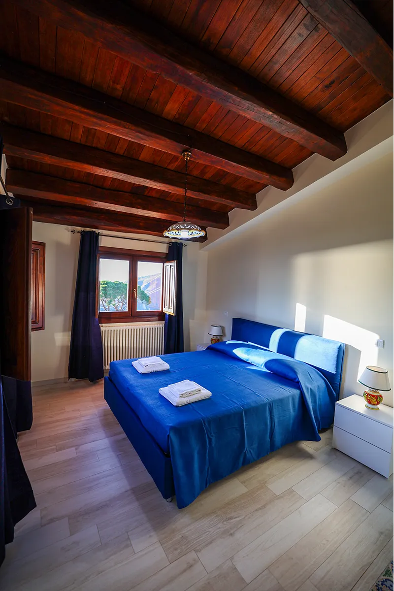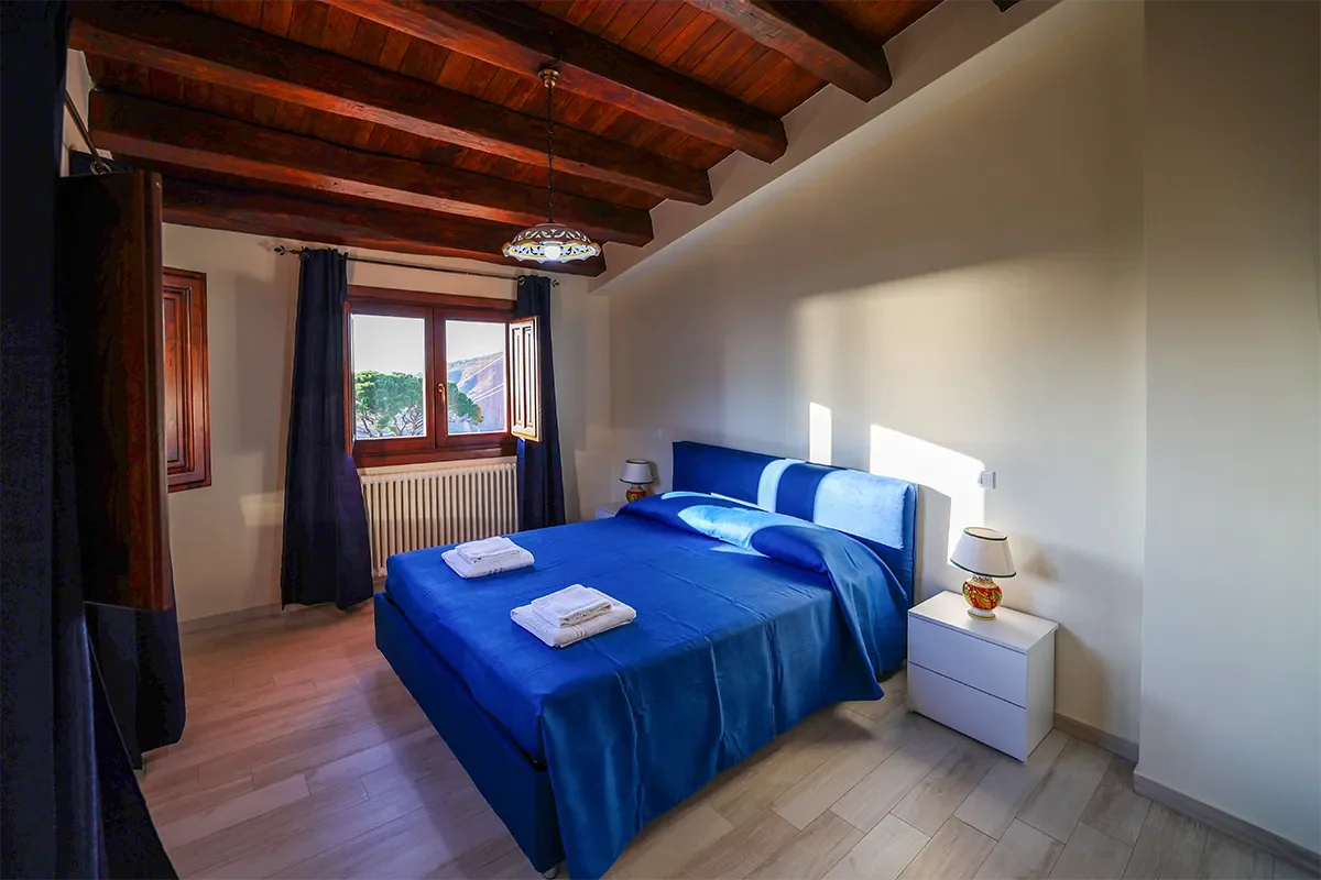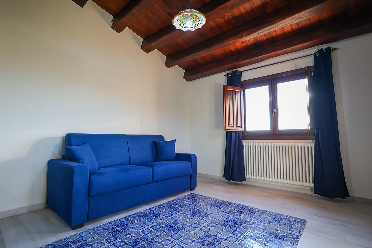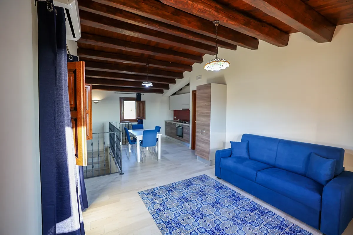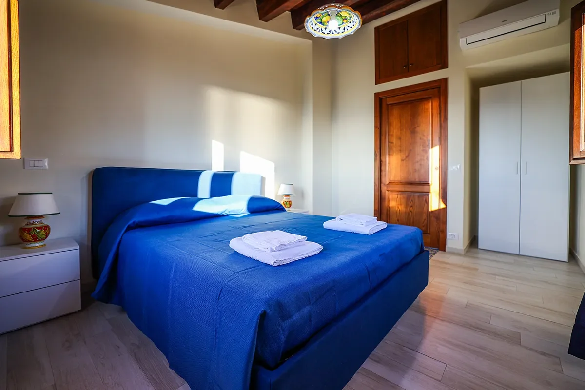 L’appartamento offre una camera matrimoniale dotata di armadio, aria condizionata e riscaldamento; la cucina attrezzata presenta una caratteristica pavimentazione in maioliche nei toni del blu e del bianco, uno dei simboli più tradizionali della Sicilia. La presenza del divano letto permette di portare il numero degli ospiti fino a 4, mentre il bagno privato offre tutti i servizi necessari per il massimo comfort.