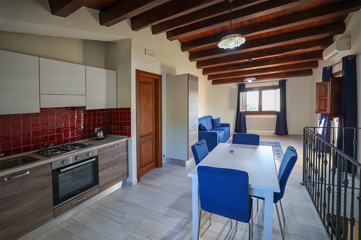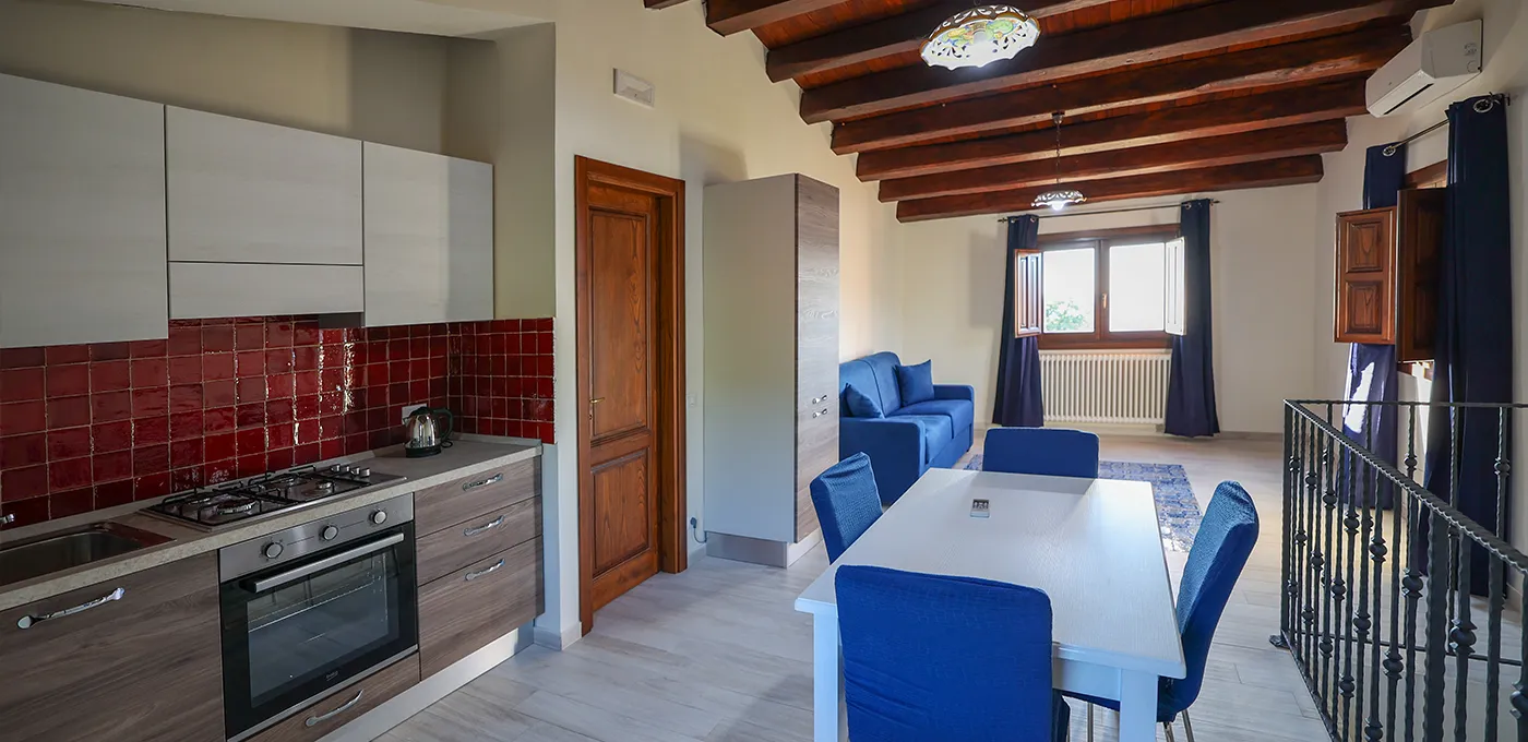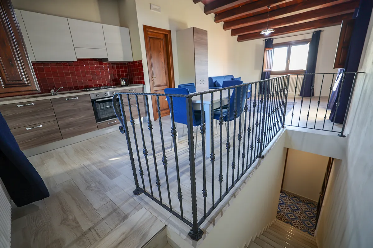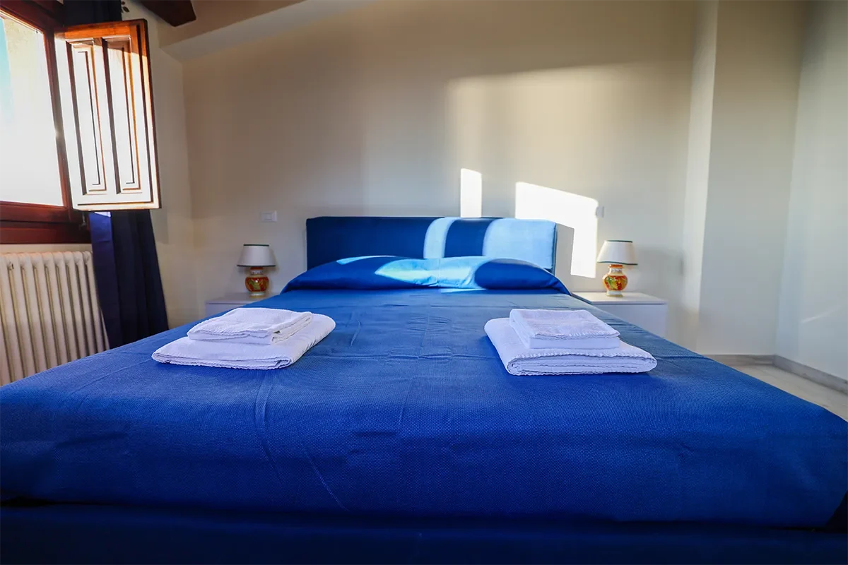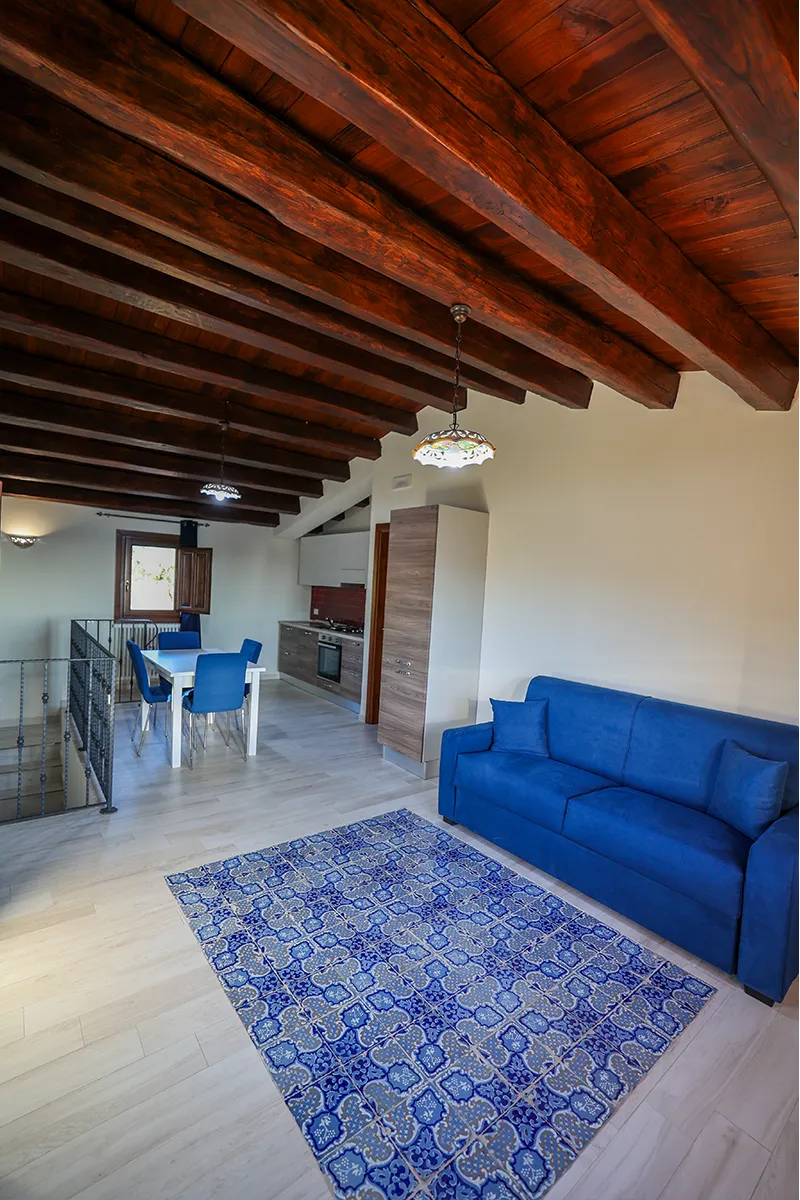 L’appartamento offre una camera matrimoniale dotata di armadio, aria condizionata e riscaldamento; la cucina attrezzata presenta una caratteristica pavimentazione in maioliche nei toni del blu e del bianco, uno dei simboli più tradizionali della Sicilia. La presenza del divano letto permette di portare il numero degli ospiti fino a 4, mentre il bagno privato offre tutti i servizi necessari per il massimo comfort.