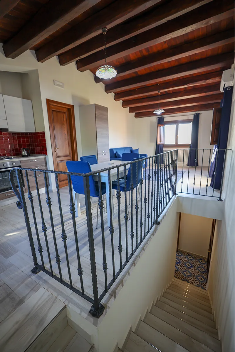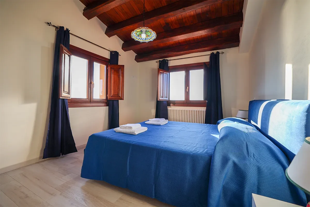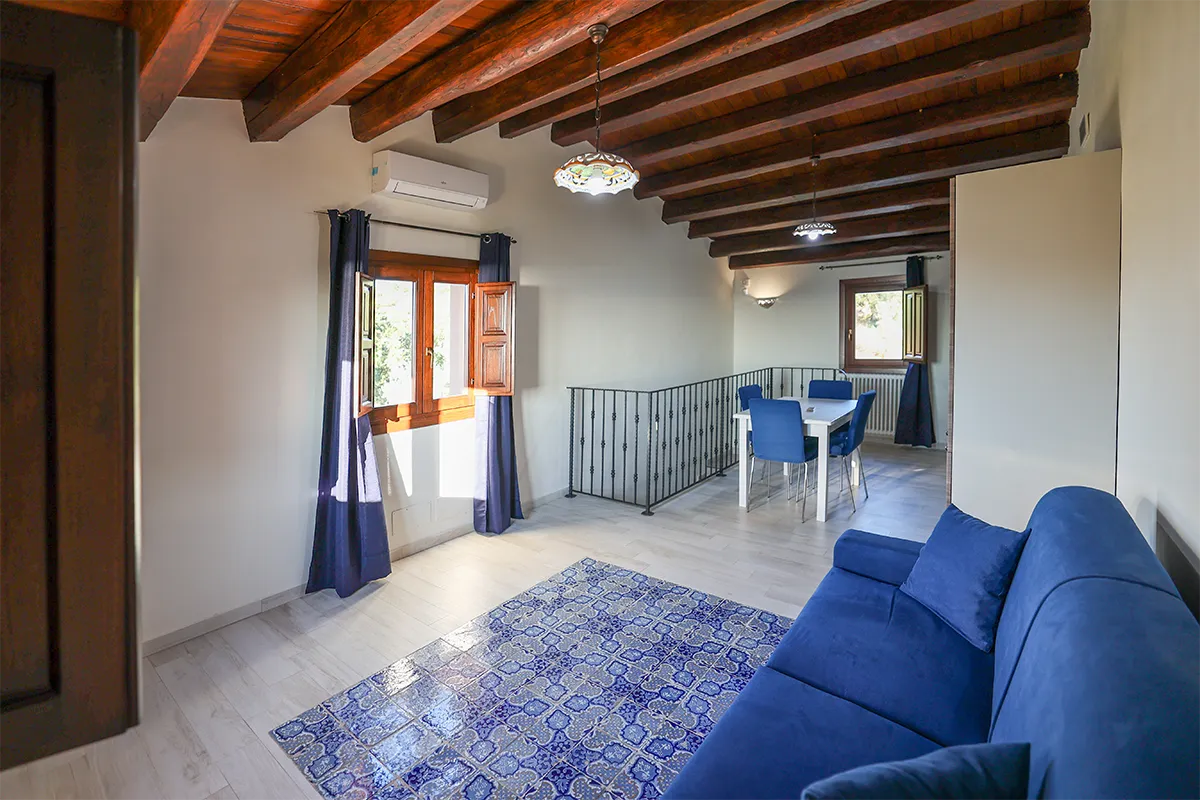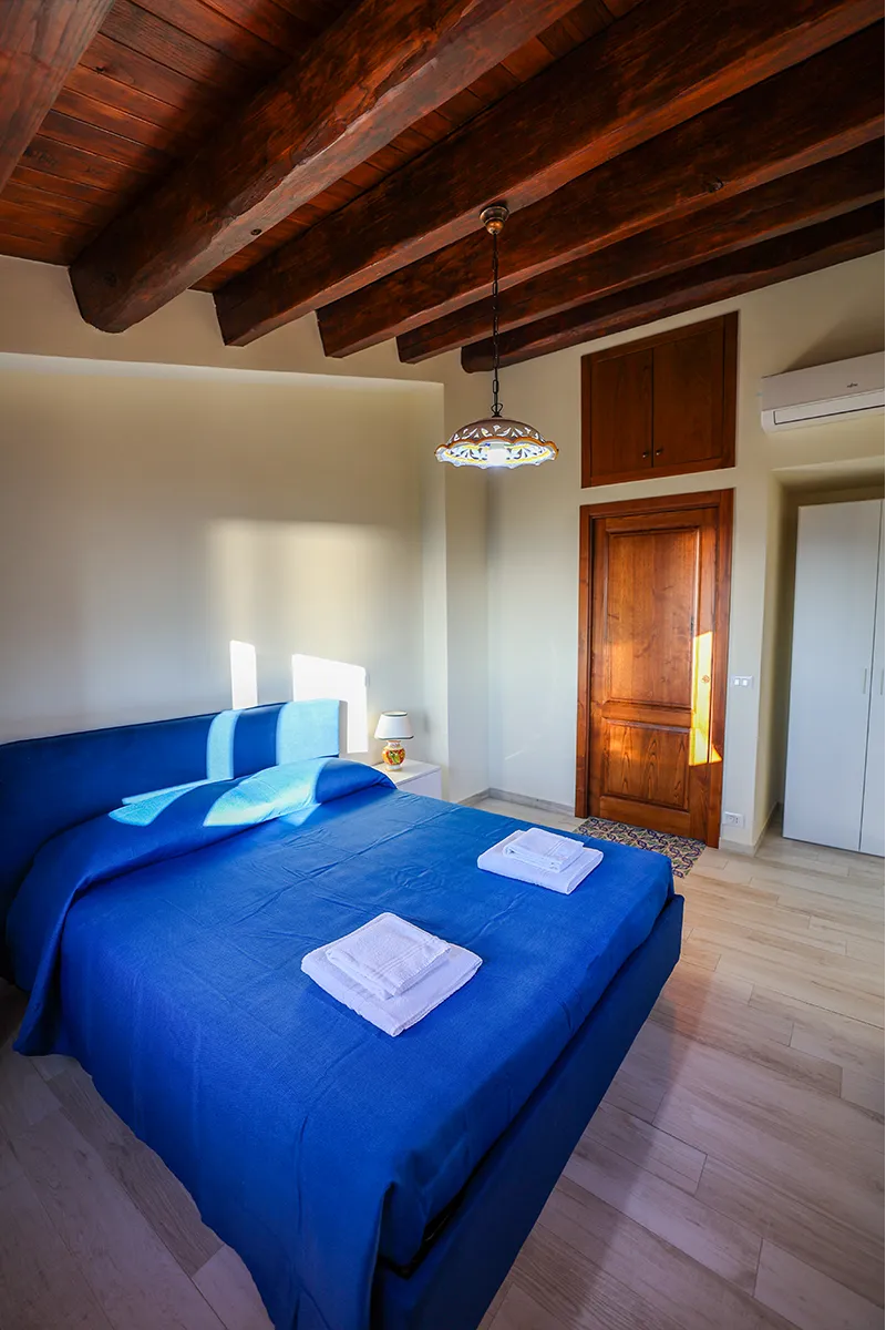 Caratterizzato da spettacolari travi in legno a vista e pavimenti in tipica maiolica siciliana bianca e blu, questo alloggio incarna il calore della Sicilia.