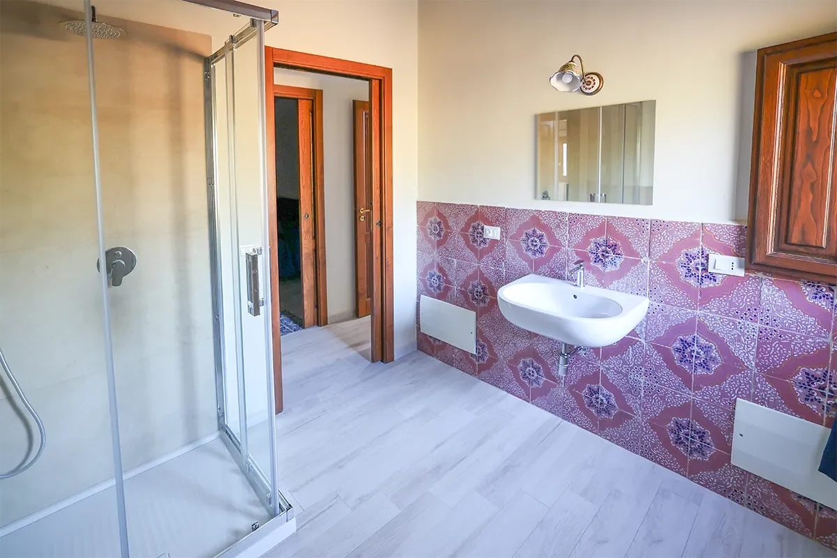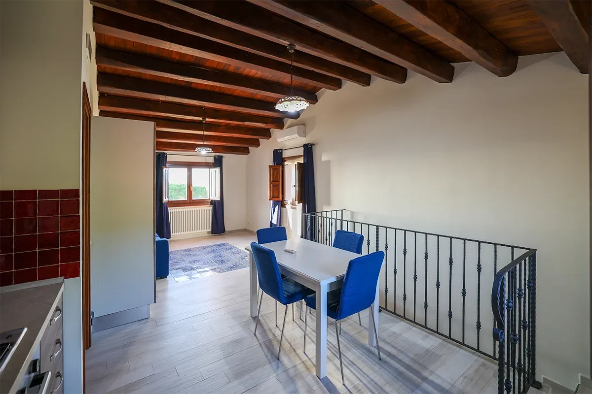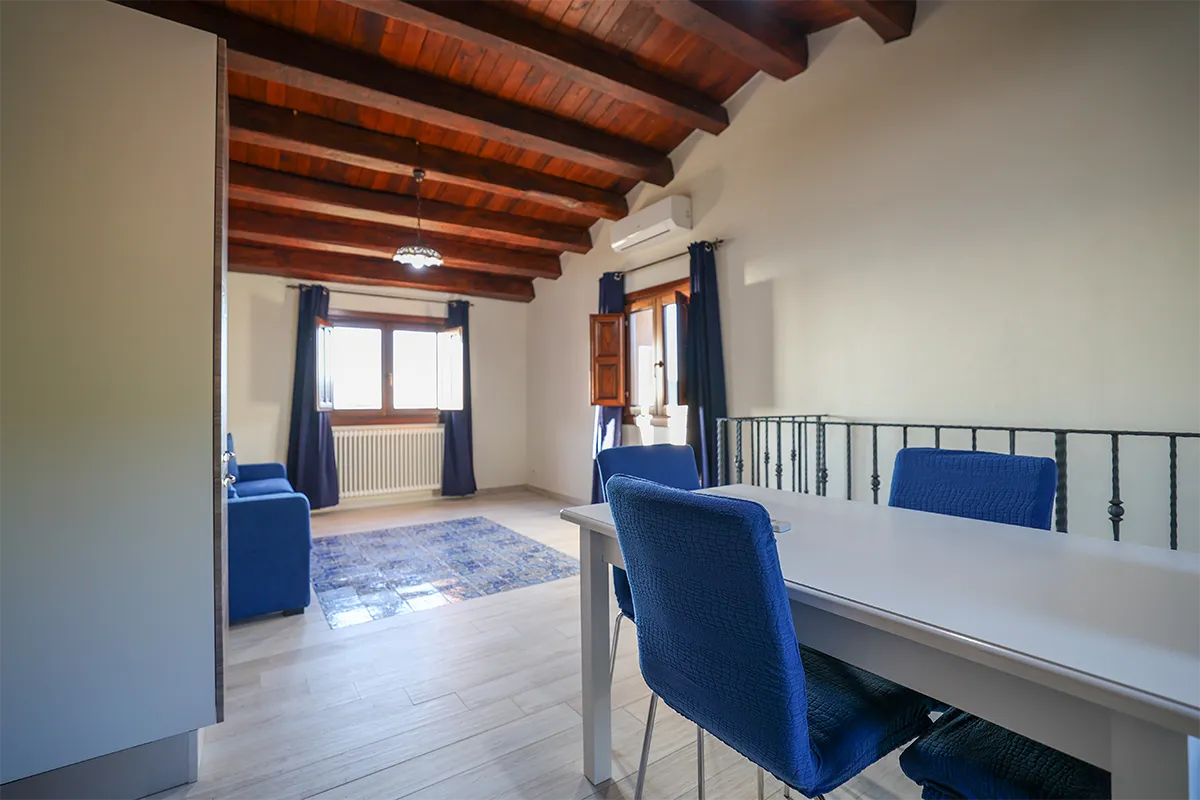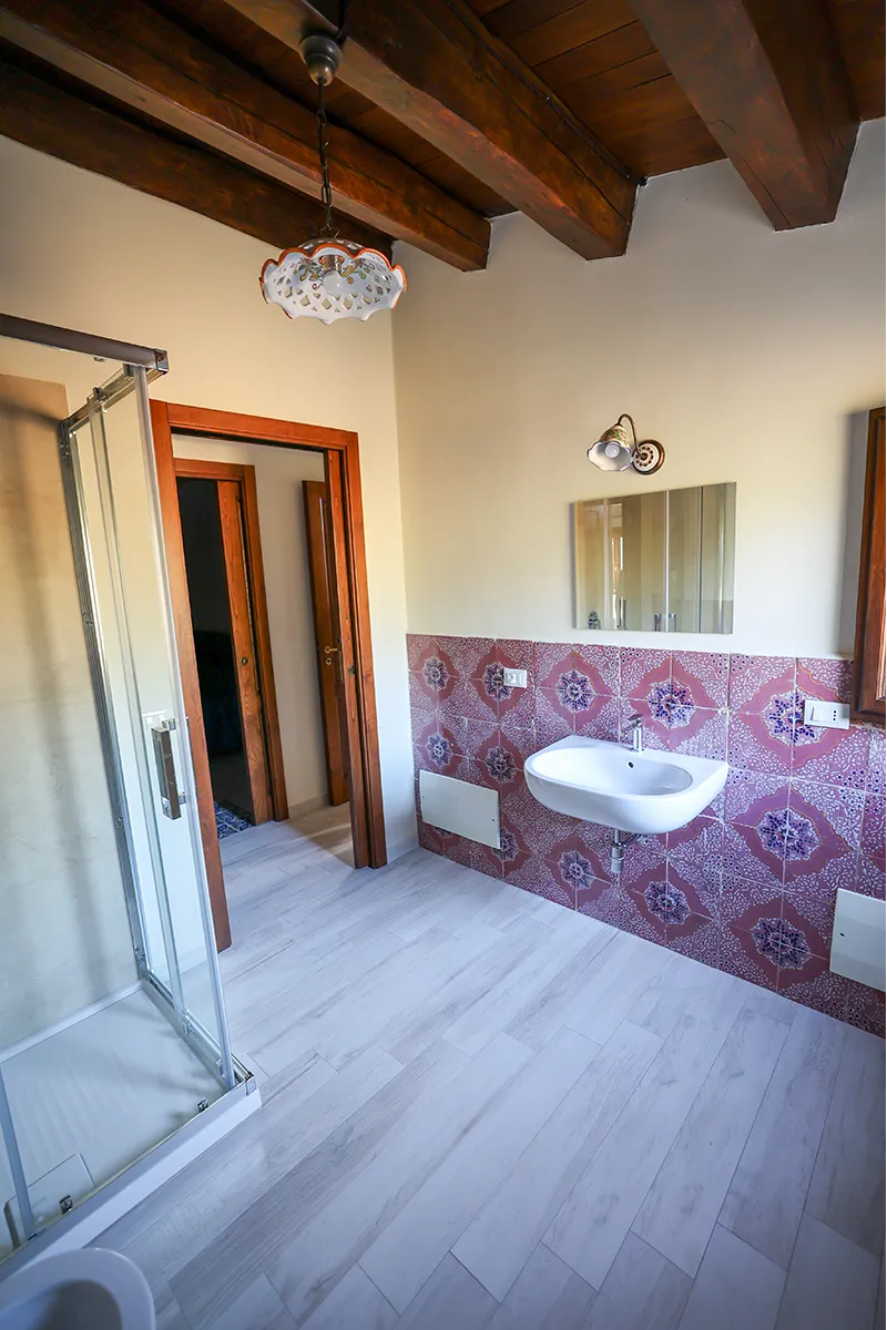 Caratterizzato da spettacolari travi in legno a vista e pavimenti in tipica maiolica siciliana bianca e blu, questo alloggio incarna il calore della Sicilia.