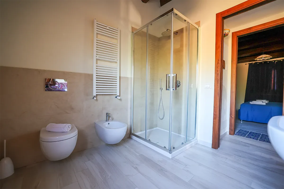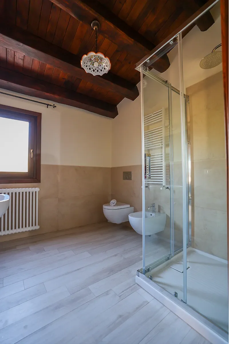 1 bagno completo di doccia o vasca, bidet, asciugacapelli e kit di cortesia.